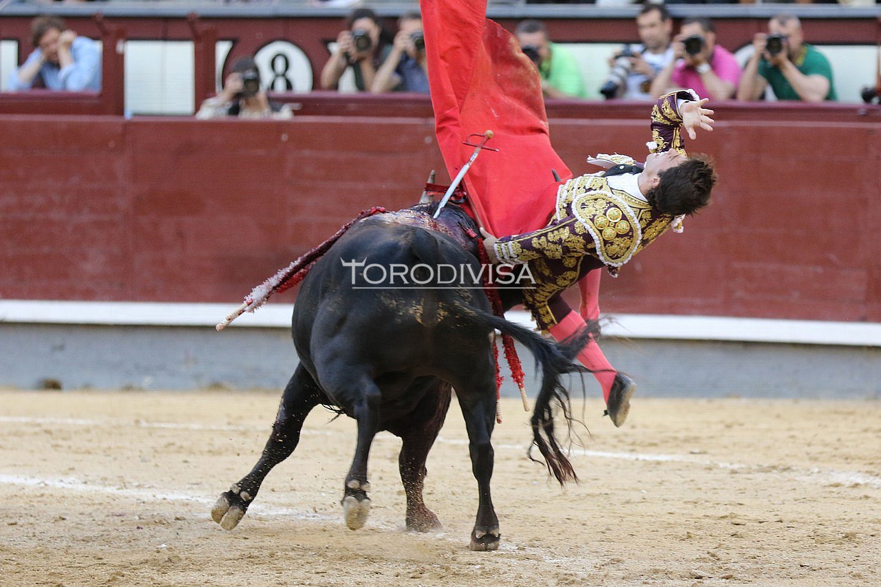Herida por asta de toro en 1/3 medio cara interna del muslo derecho, con rotura de vena safena y femoral y contunde arteria femoral y nervio crural, con asusencia de pulso en arteria pedia, contornea fémur y alcanza cara externa del muslo. Es intervenido quirúrgicamente en la enfermeria de la plaza de toros de Las Ventas. Pronostico: Muy grave. Firmado, Dr Garcia Padros.